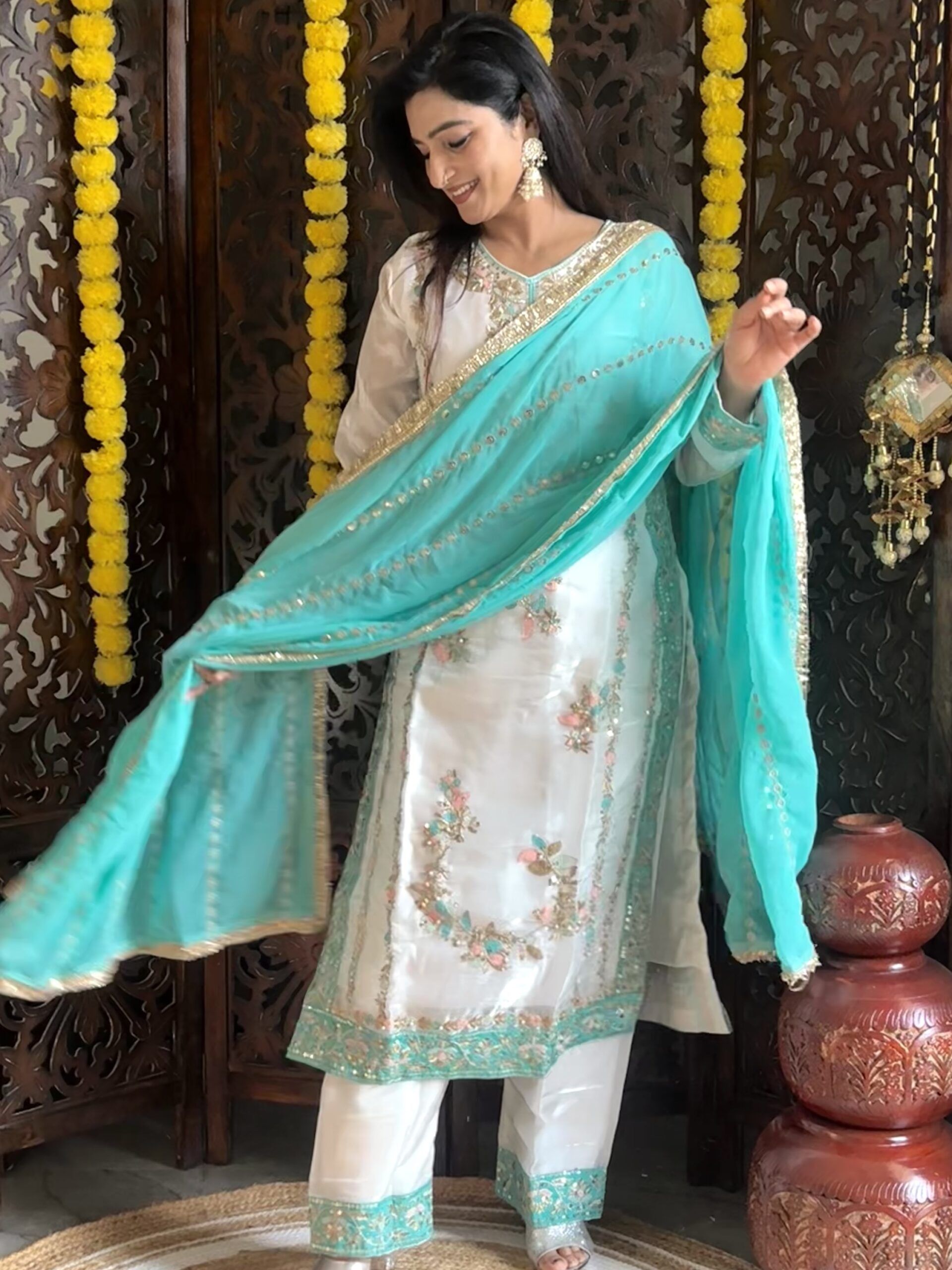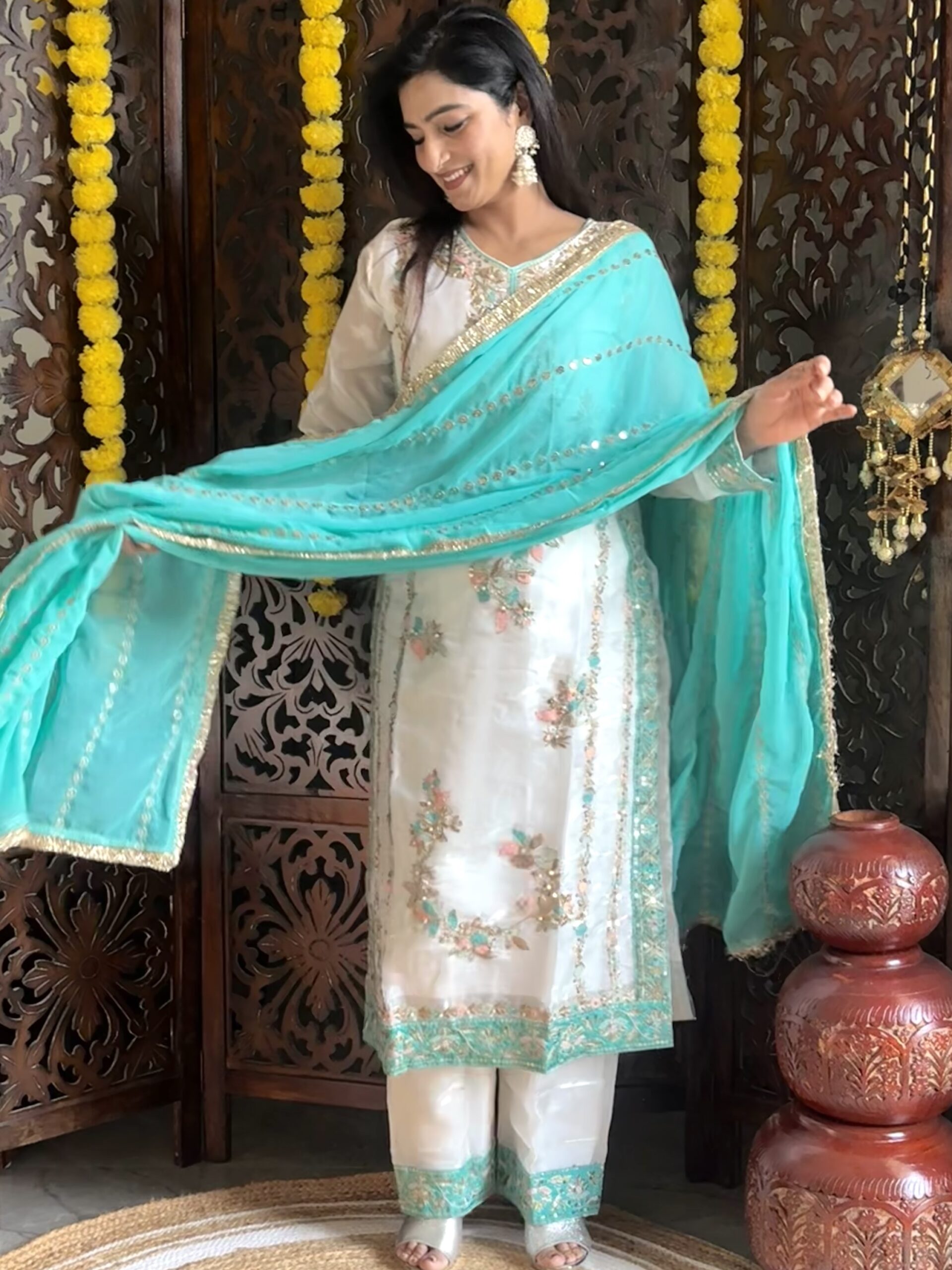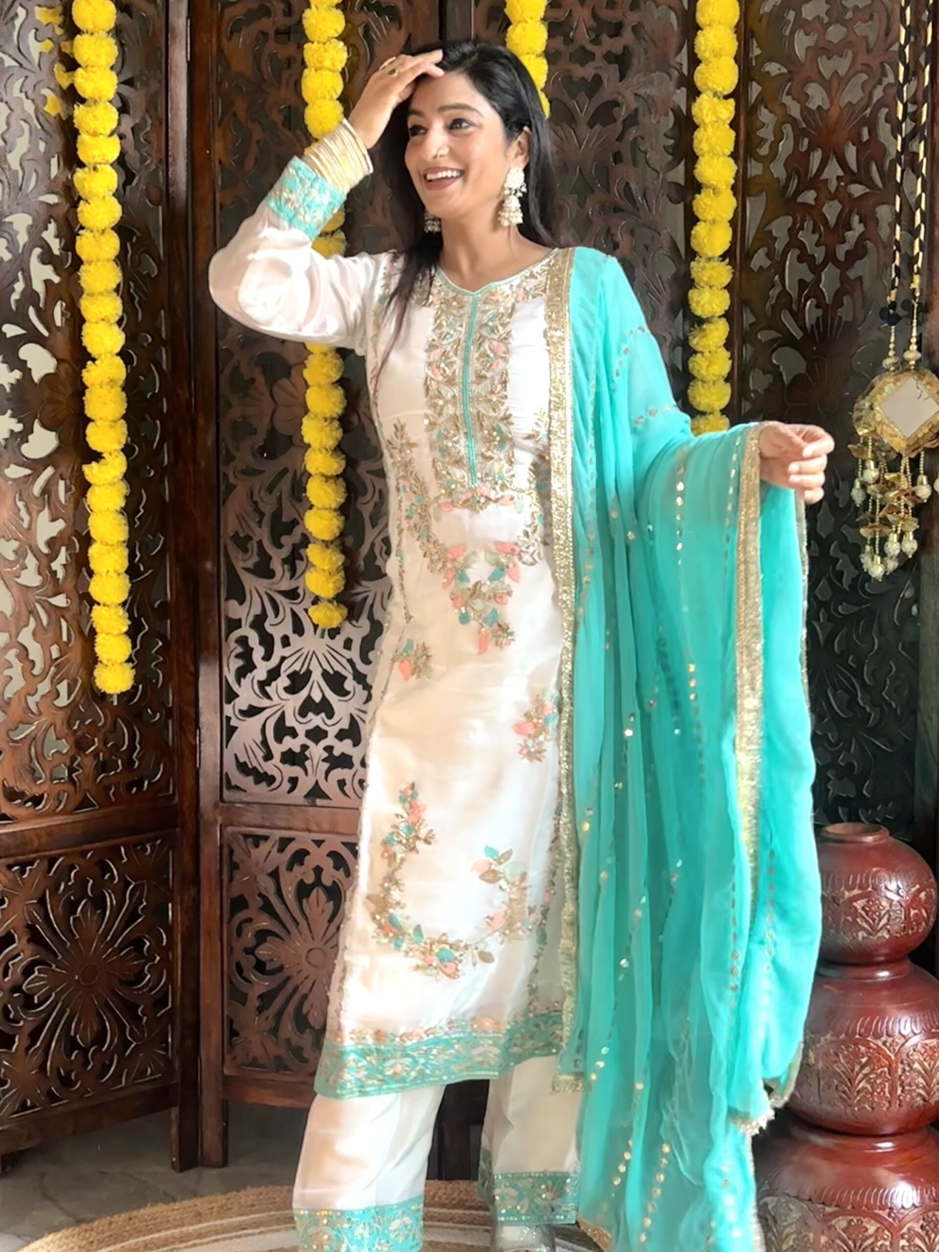 A graceful straight suit set designed for festive and special occasions. The outfit features delicate sequin and moti work, paired with a stylish palazzo bottom and a lightweight faux georgette dupatta for an elegant and comfortable look.