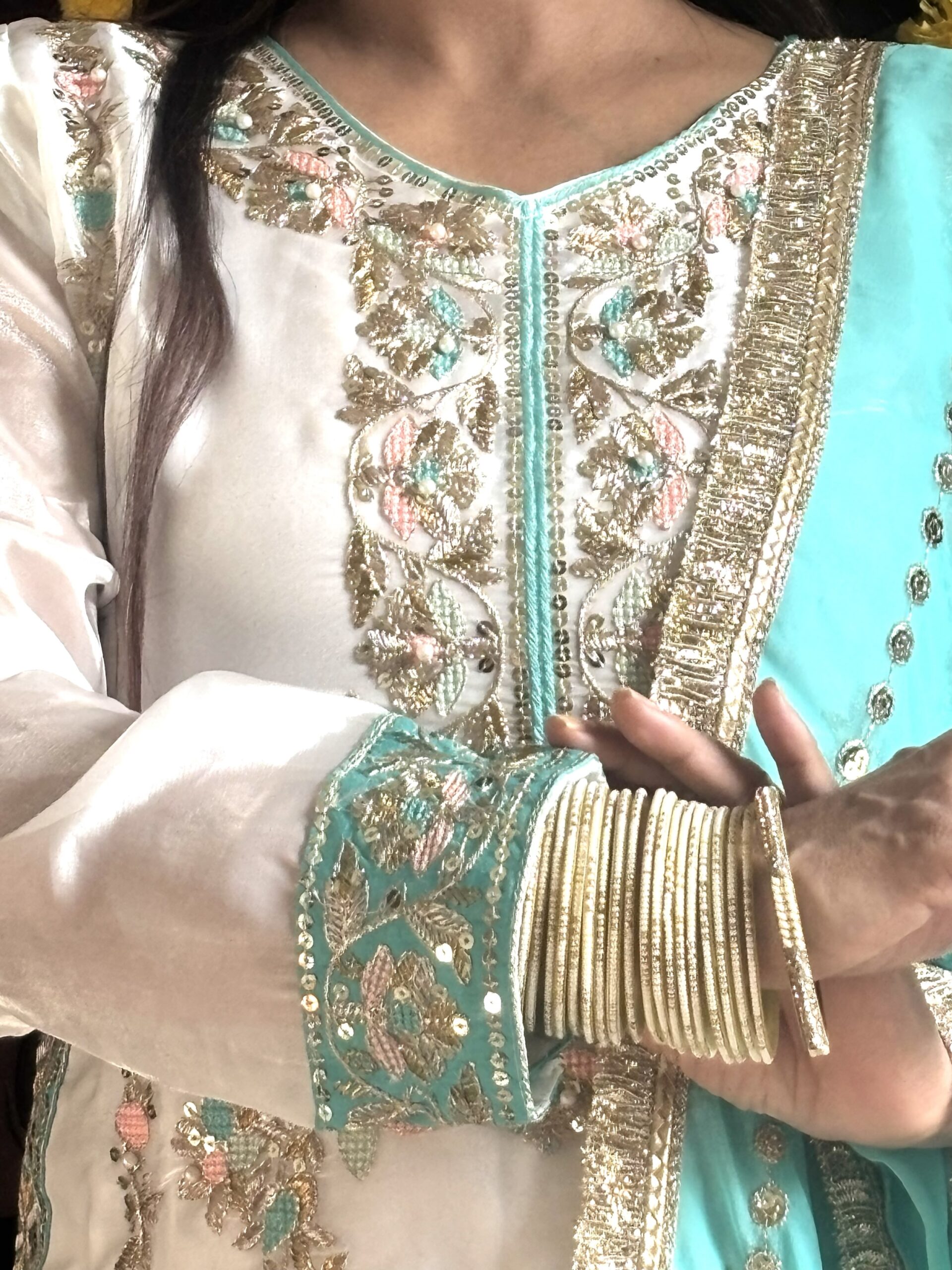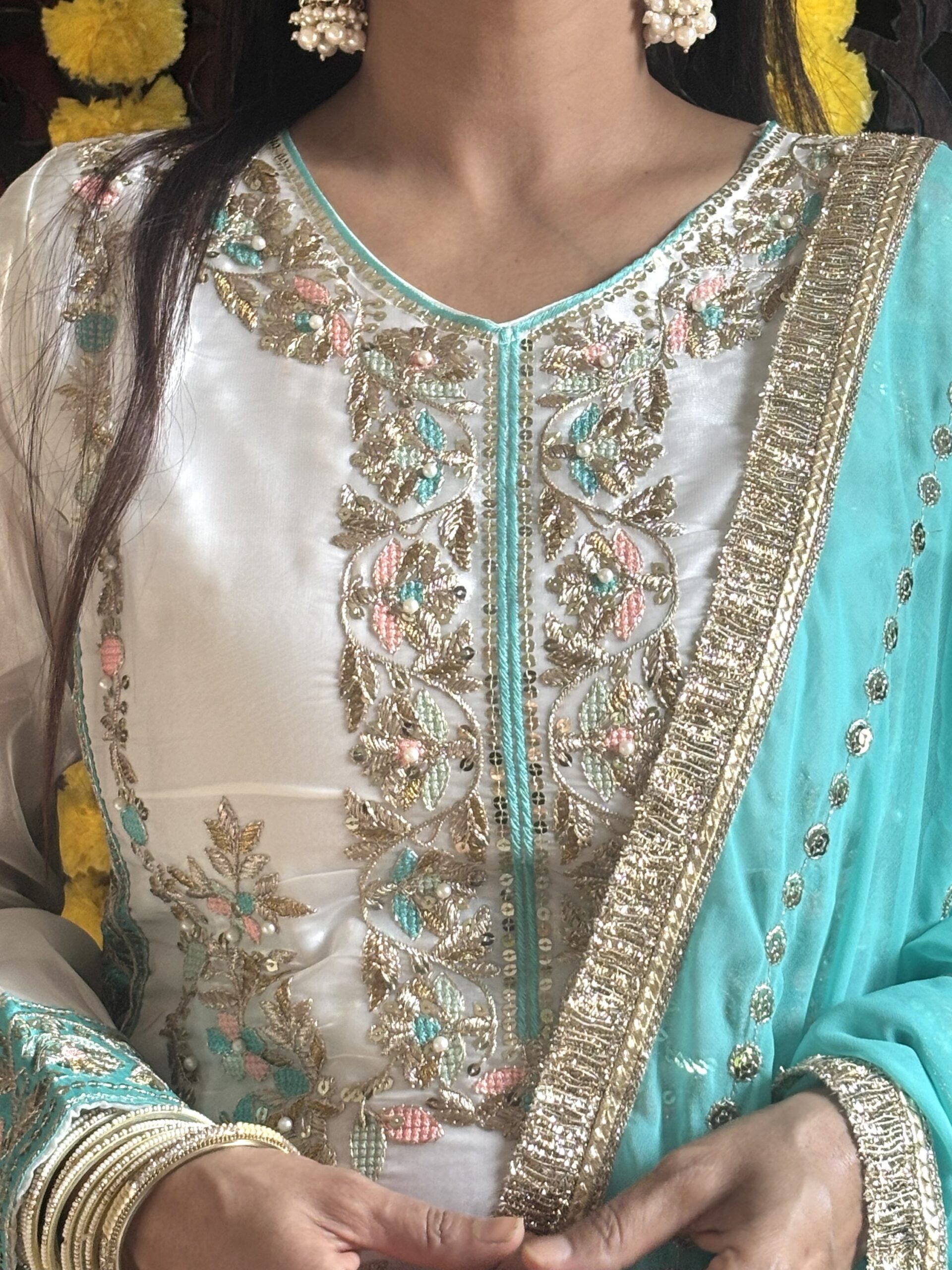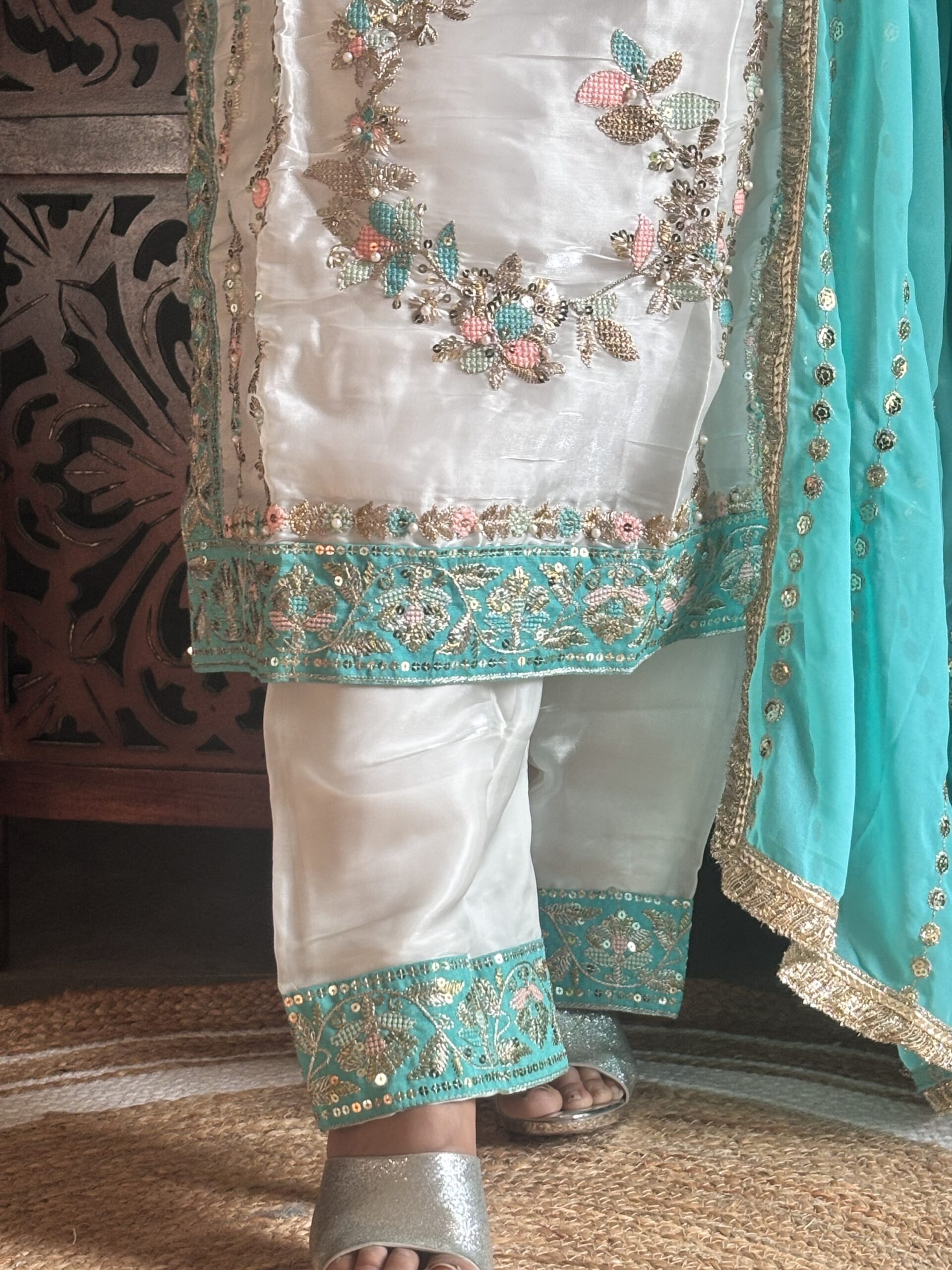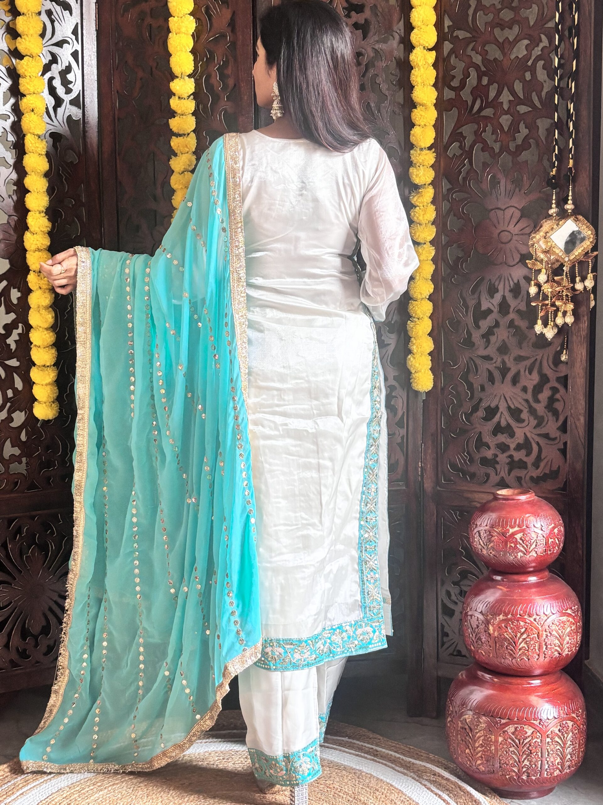 A graceful straight suit set designed for festive and special occasions. The outfit features delicate sequin and moti work, paired with a stylish palazzo bottom and a lightweight faux georgette dupatta for an elegant and comfortable look.