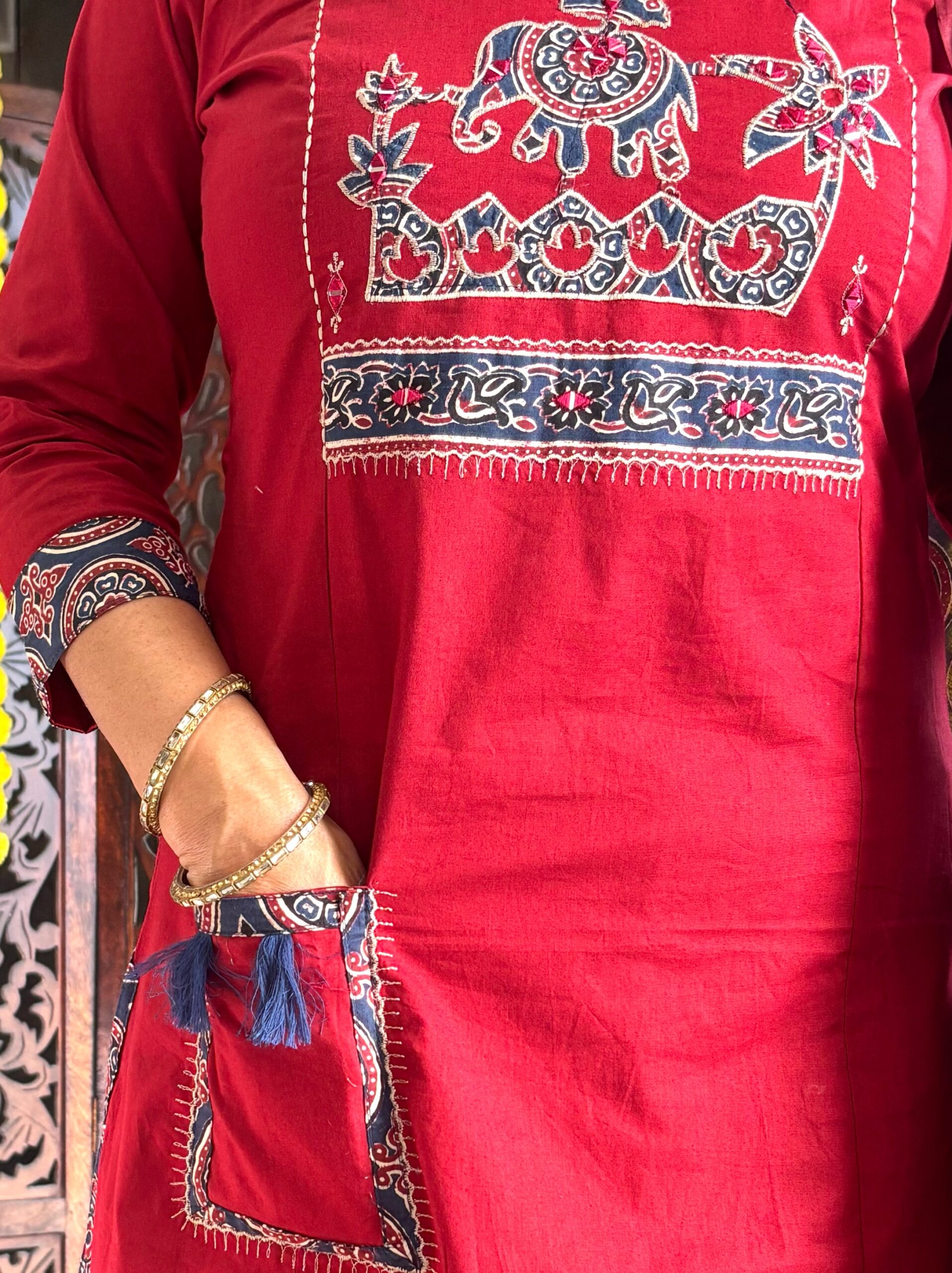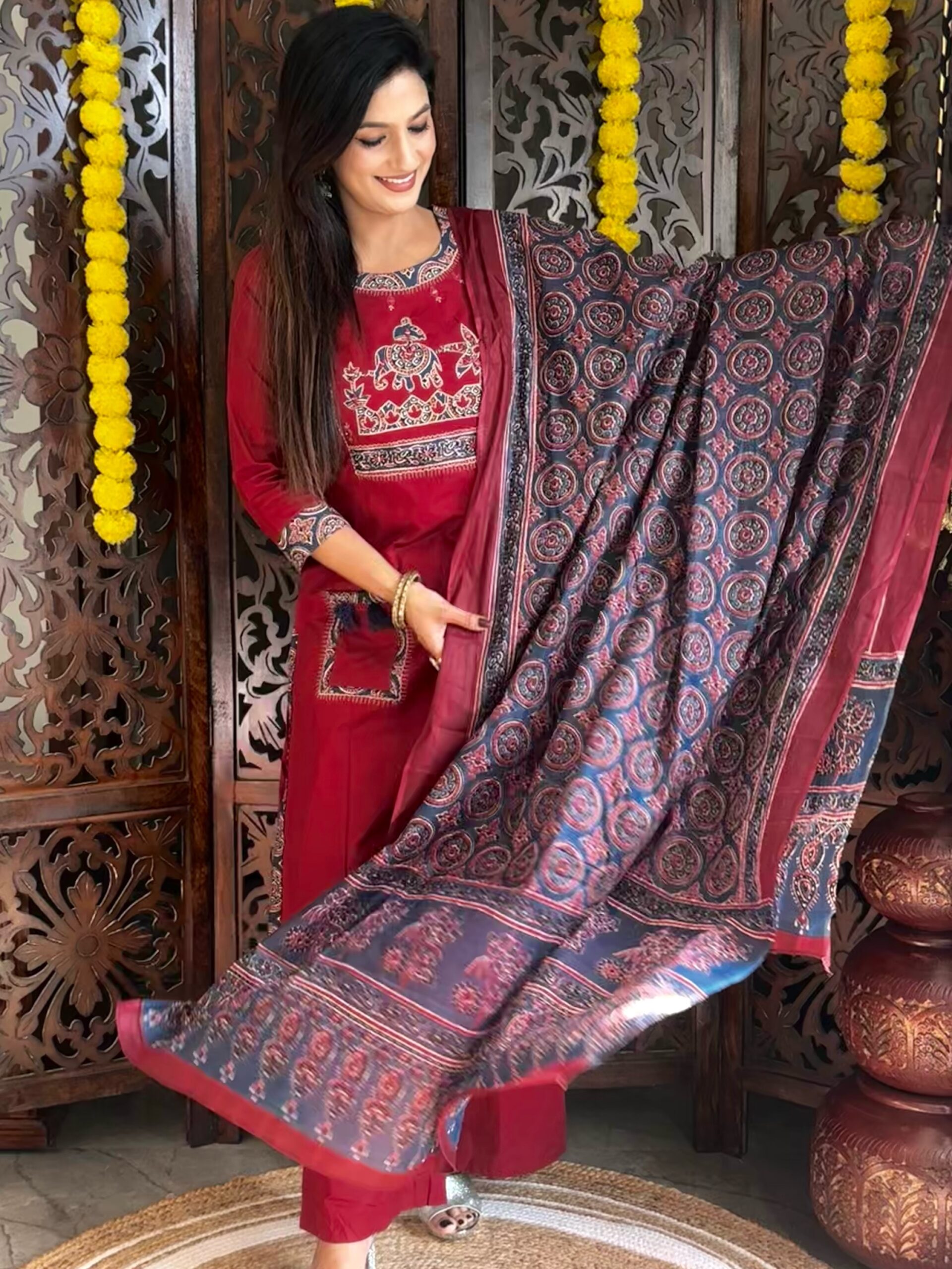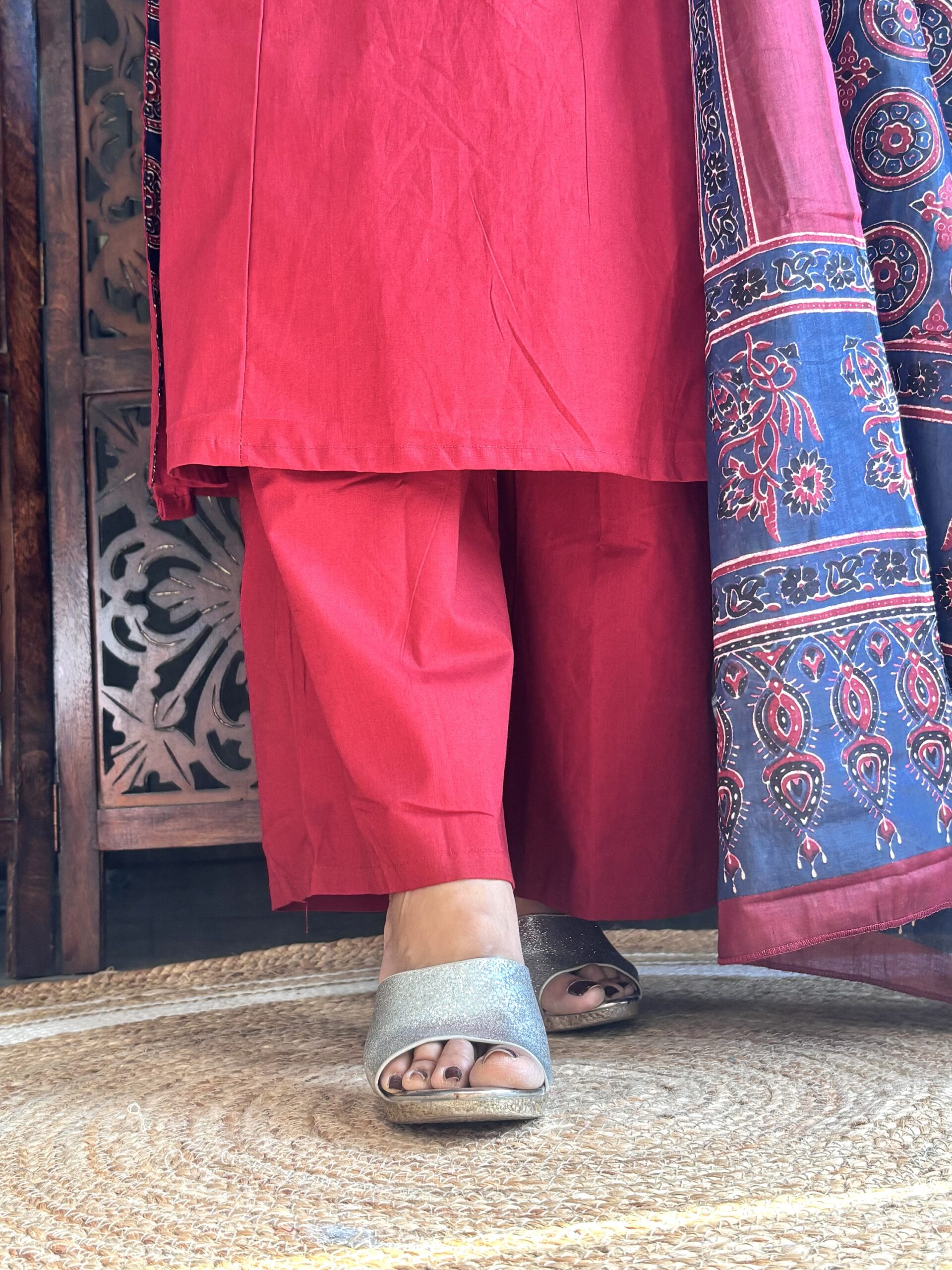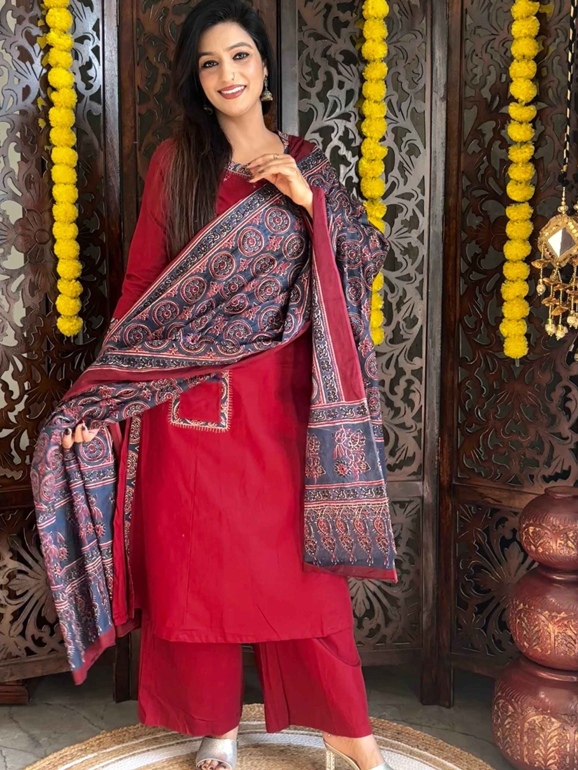 Step into effortless elegance with this premium cotton Dabu A-line kurta, featuring beautiful applique printed patchwork at the yoke for a unique handcrafted touch. Paired with a contrast Ajrakh printed dupatta and comfortable cotton plazo pants, this set is perfect for a graceful everyday look or subtle festive styling.
