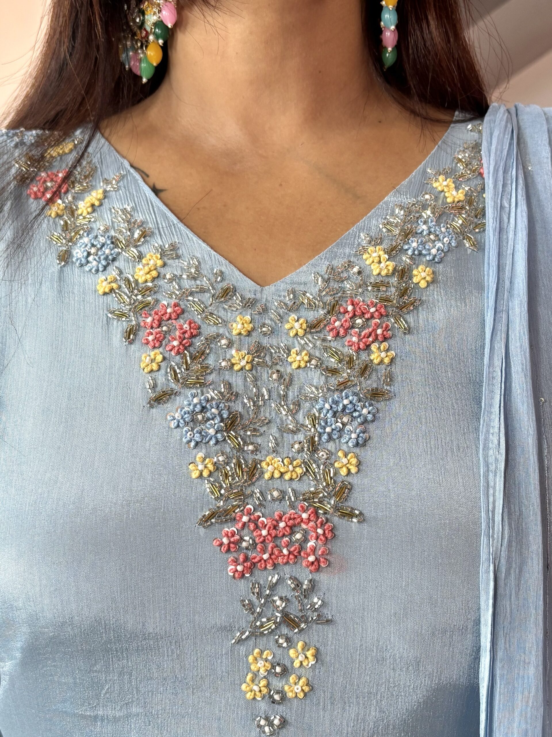 A graceful powdered blue chinon suit set featuring delicate handwork on the neckline. Designed with a soft cotton mal lining for comfort and paired with a lightweight chiffon dupatta,